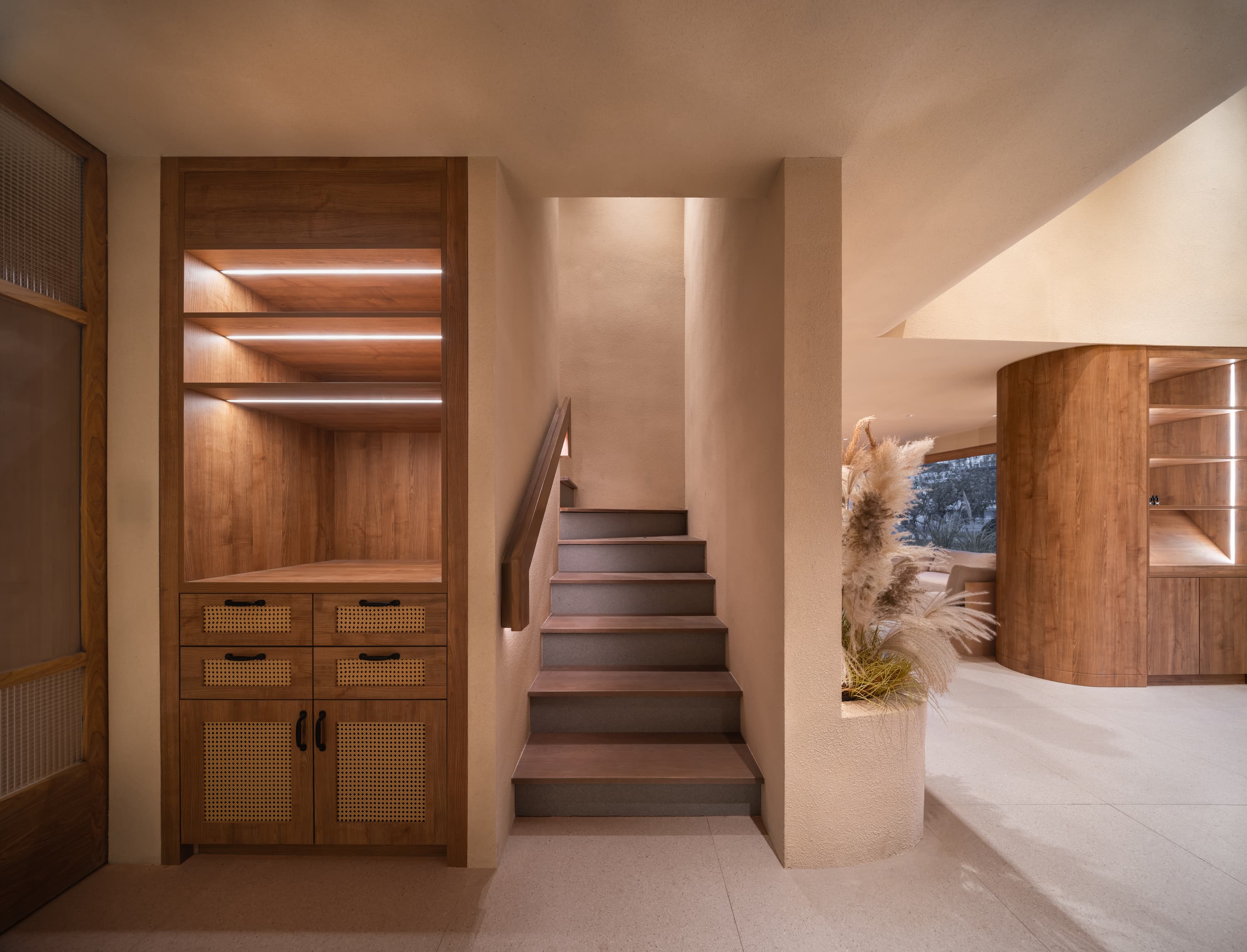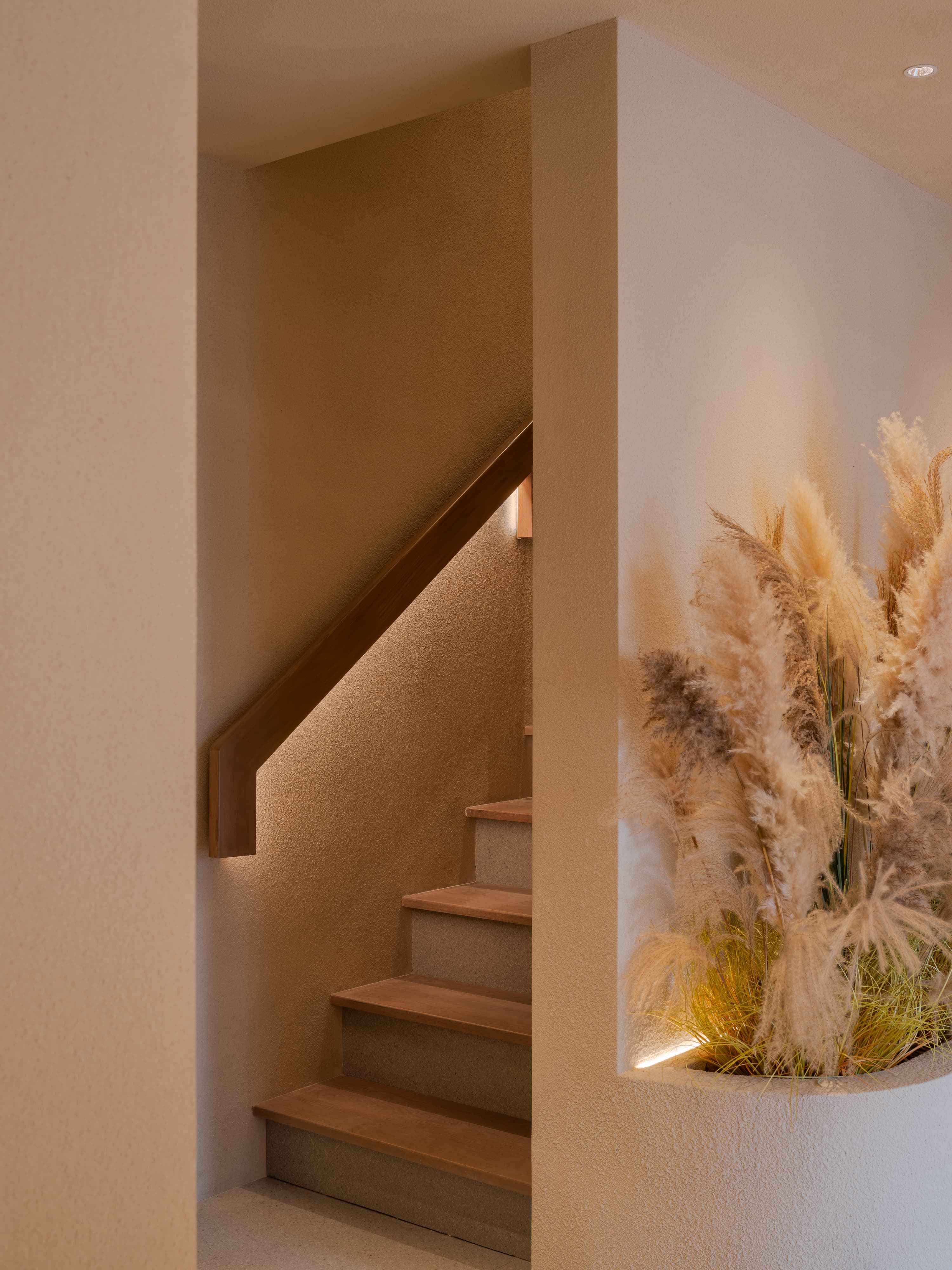 以纯净的同色系为基底,营造出宁静深邃的空间氛围。运用肌理涂料的细腻纹理、手工砖的质朴触感以及仿石材的质感,将舒适的自然气息融入室内环境。在暖色光源的烘托下,空间呈现出温馨柔和的气氛,让人感受到无限的放松。