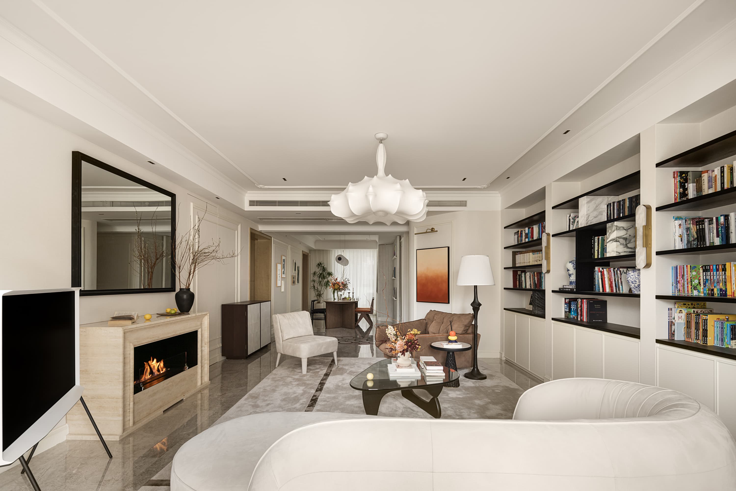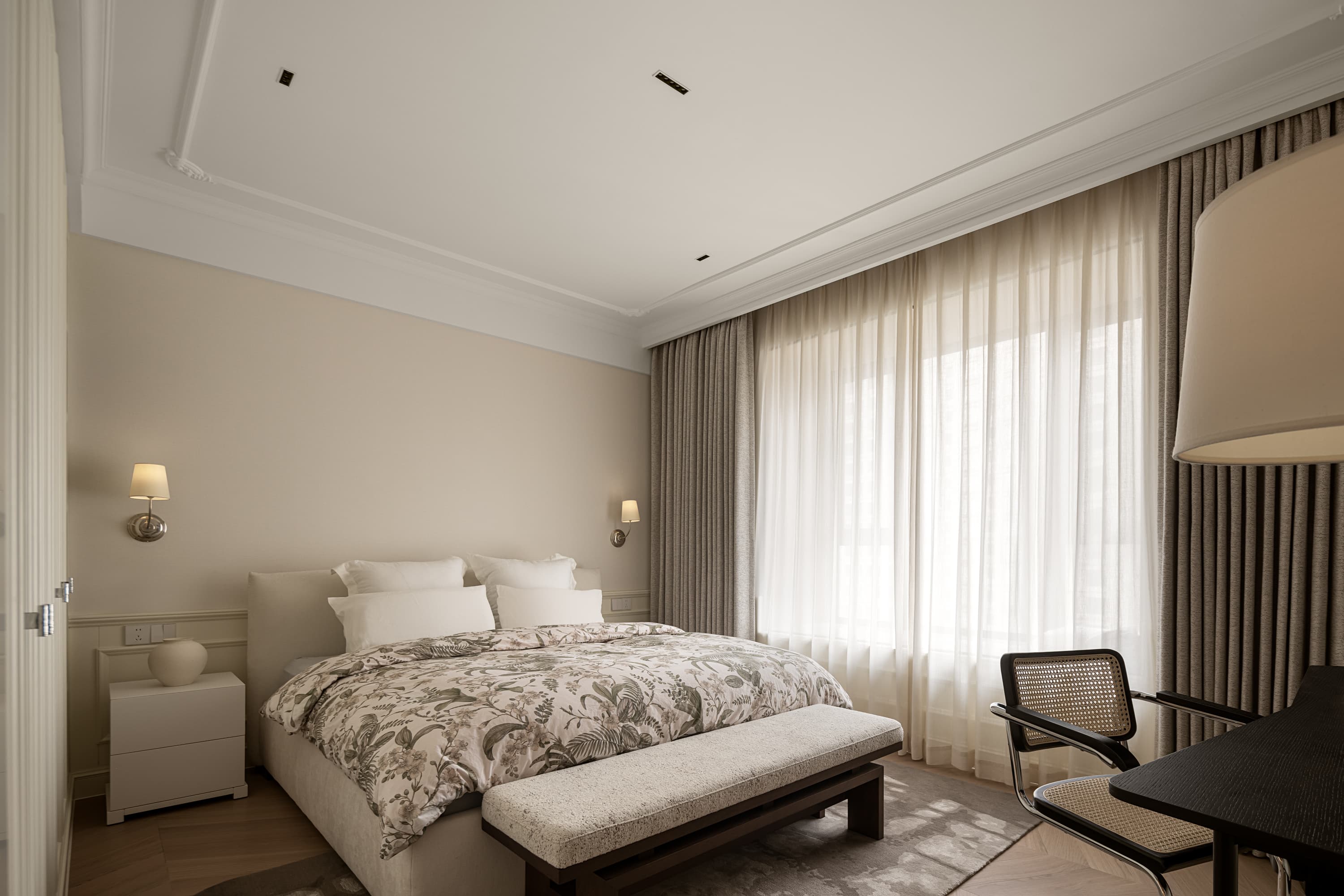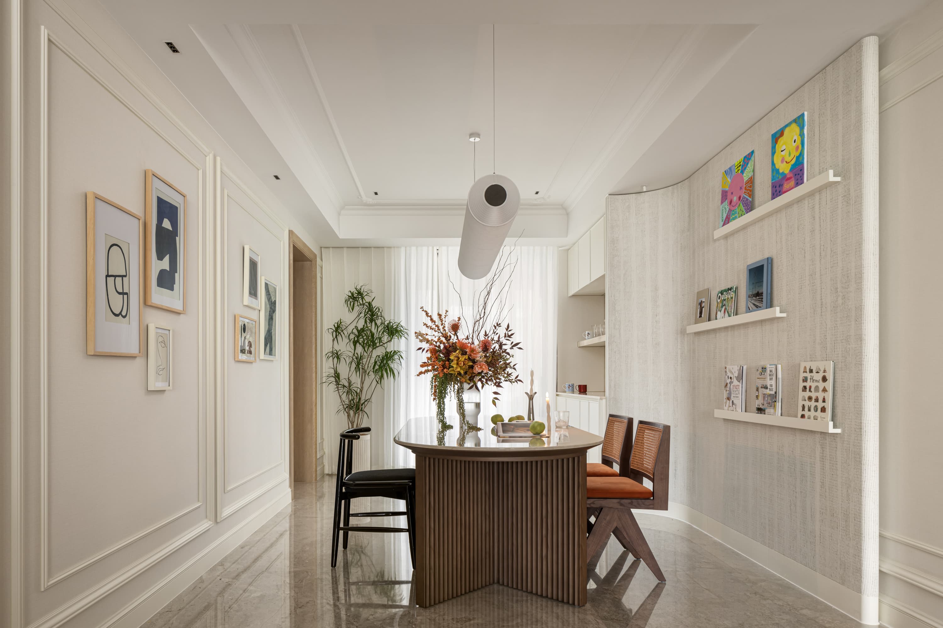 这套私宅融合了法式浪漫与现代简约,以米白色为主色调,给人明亮、高雅的感觉。空间上注重开放性和流动感,强调线条的流畅和家具的质感,不仅满足了业主日常生活需要,还营造出温馨舒适的居家氛围。